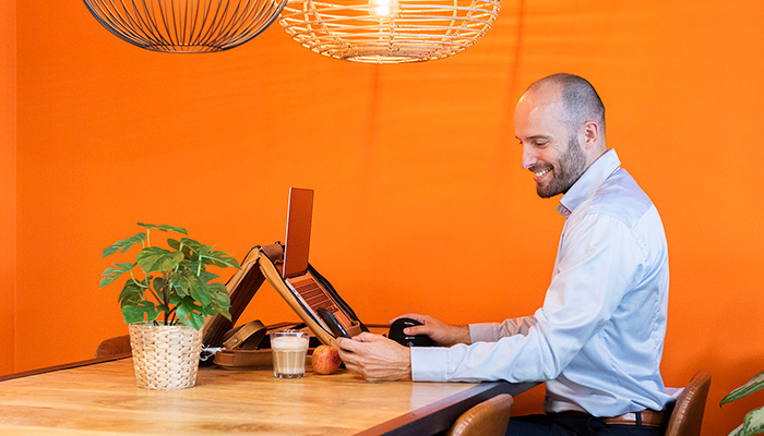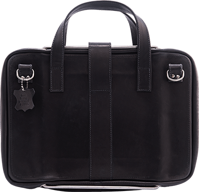 Ergonomic laptop bag with integrated laptop stand, social product made of Gold certified full grain leather. Available in black and brown.